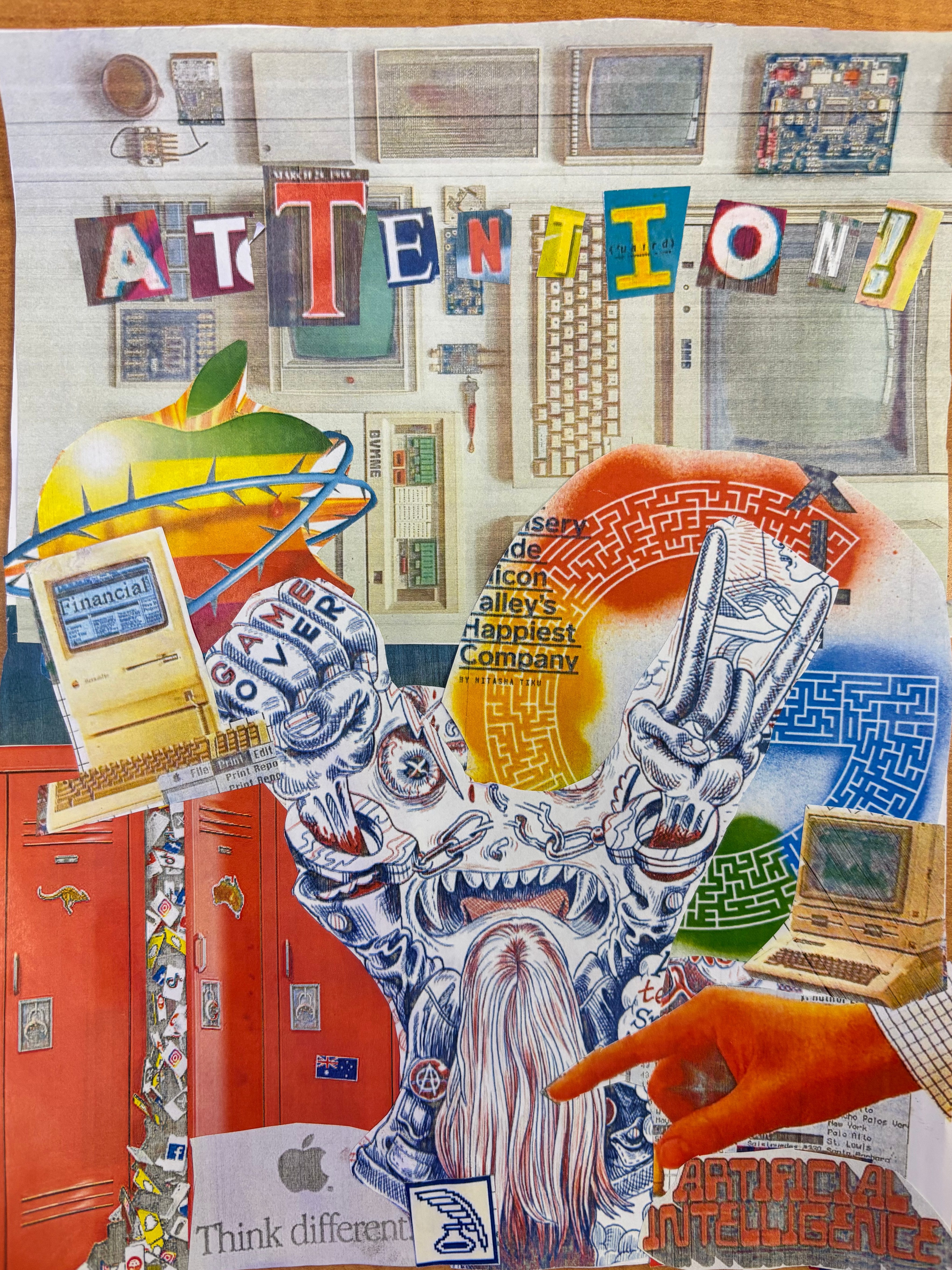 Throughout the course, students are given the opportunity to put course concepts into practice by making their own media. A few examples of student work appear below, made during “Analog Day”–a day we collectively log off and discuss the complexities of